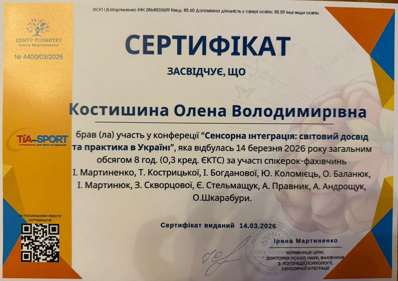 • Участь у конференції “Сенсорна інтеграція: світовий досвід та практика в Україні”, Центр розвитку Ірини Мартиненко, 2026 р.
