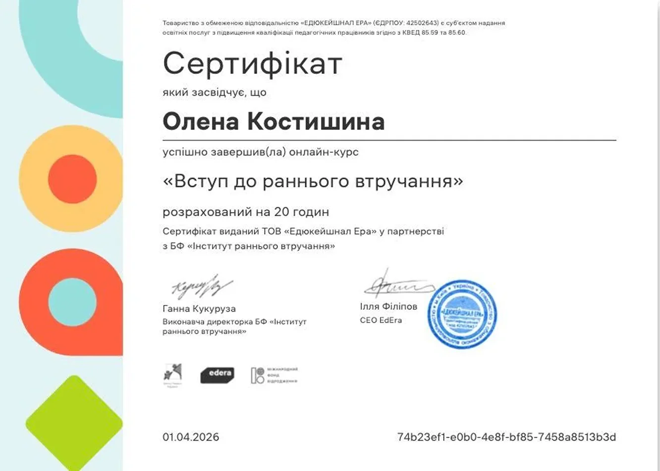 • Онлайн-курс “Вступ до раннього втручання”, ТОВ “Едюкейшнал Ера” у партнерстві з БФ “Інститут раннього втручання”, 2026 р.