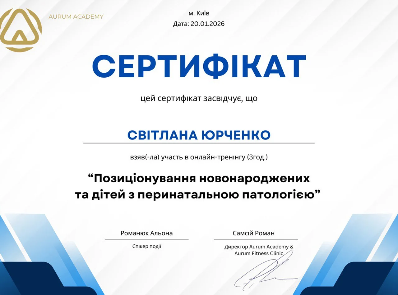 - Участь в онлайн-тренінгу “Позиціонування новонароджених та дітей з перинатальною патологією”, AURUM ACADEMY, 2026 р.