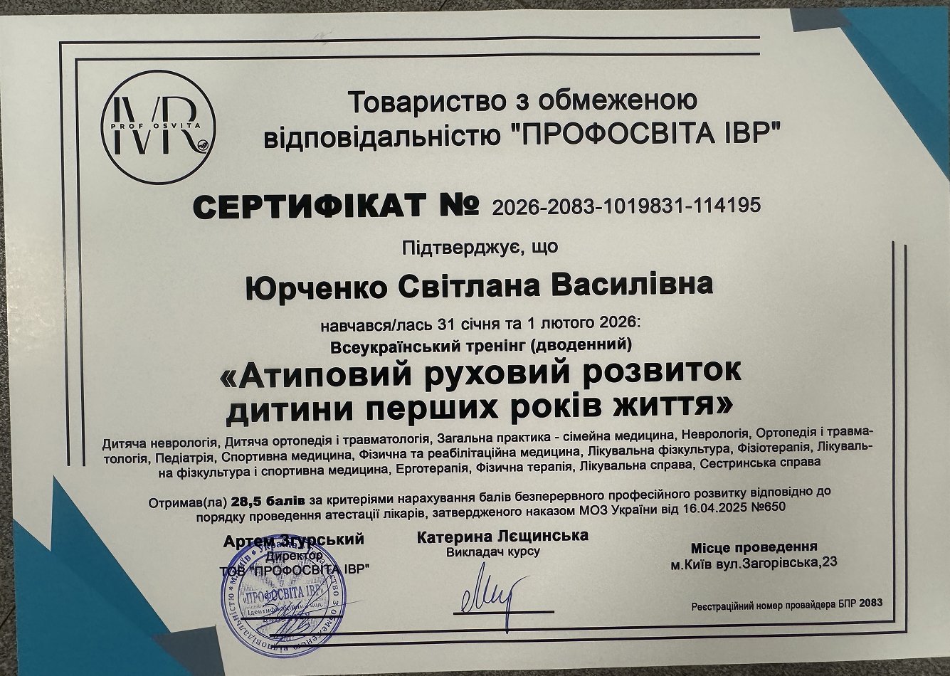 - Участь у всеукраїнському тренінгу “Атиповий руховий розвиток дитини перших років життя”, ТОВ “ПРОФОСВІТА ІВР “, 2026 р.