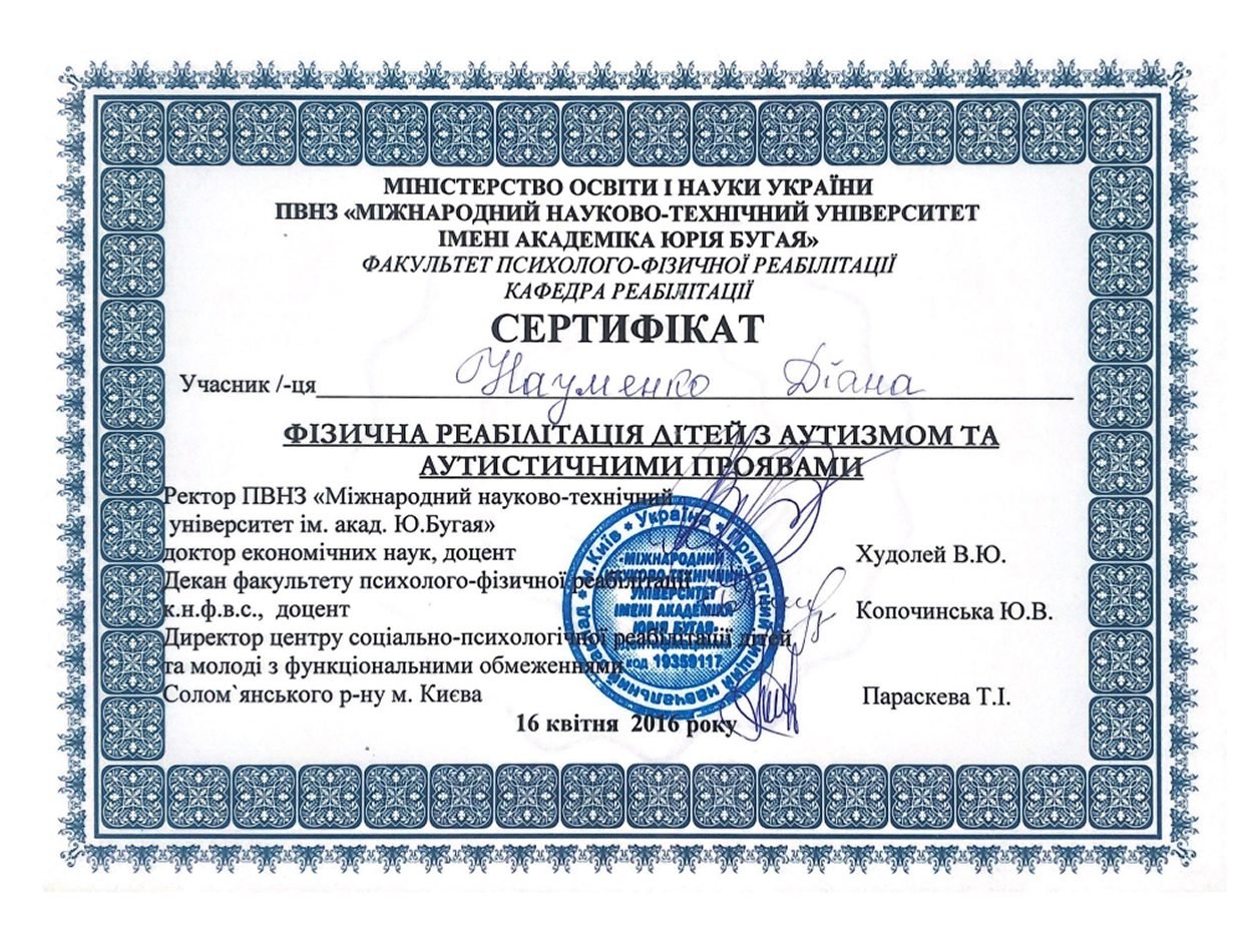 • “Фізична реабілітація дітей з аутизмом та аутистичними проявами”, “Міжнародний науково-технічний університет імені академіка Юрія Бугая”, 2016 р.