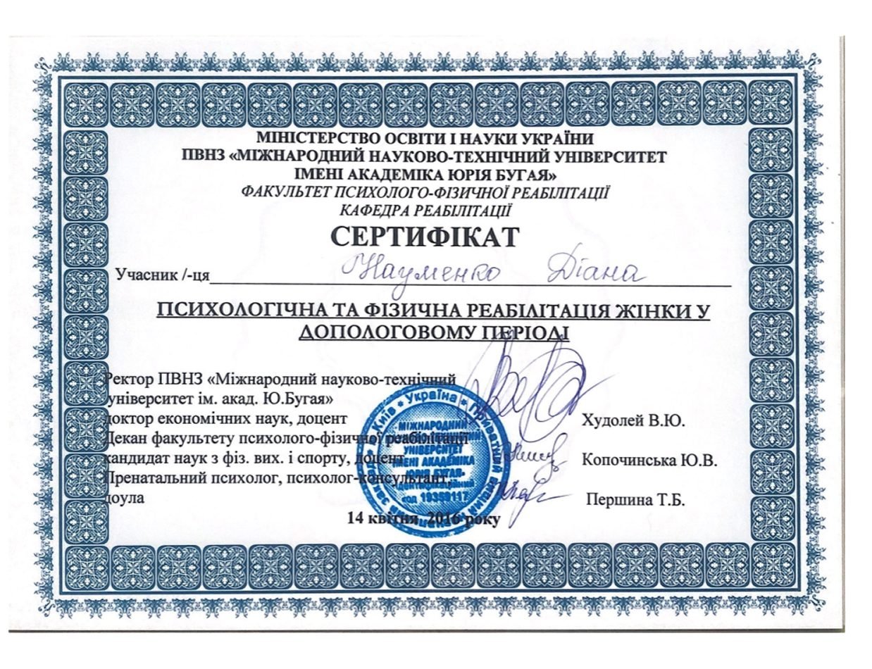 • “Психологічна та фізична реабілітація жінки у допологовому періоді”, “Міжнародний науково-технічний університет імені академіка Юрія Бугая”, 2016 р.
