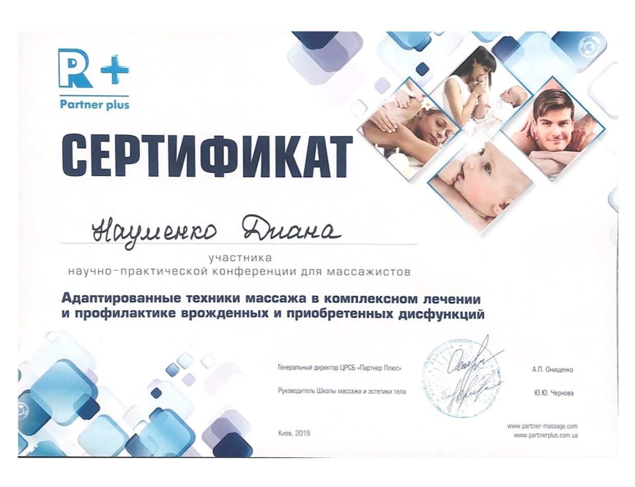 • Научно-практична конференція для масажистів, “Адаптовані техніки масажу в комплексному лікуванні і профілактиці вроджених і набутих дисфункцій”, Partner plus, 2019 р.