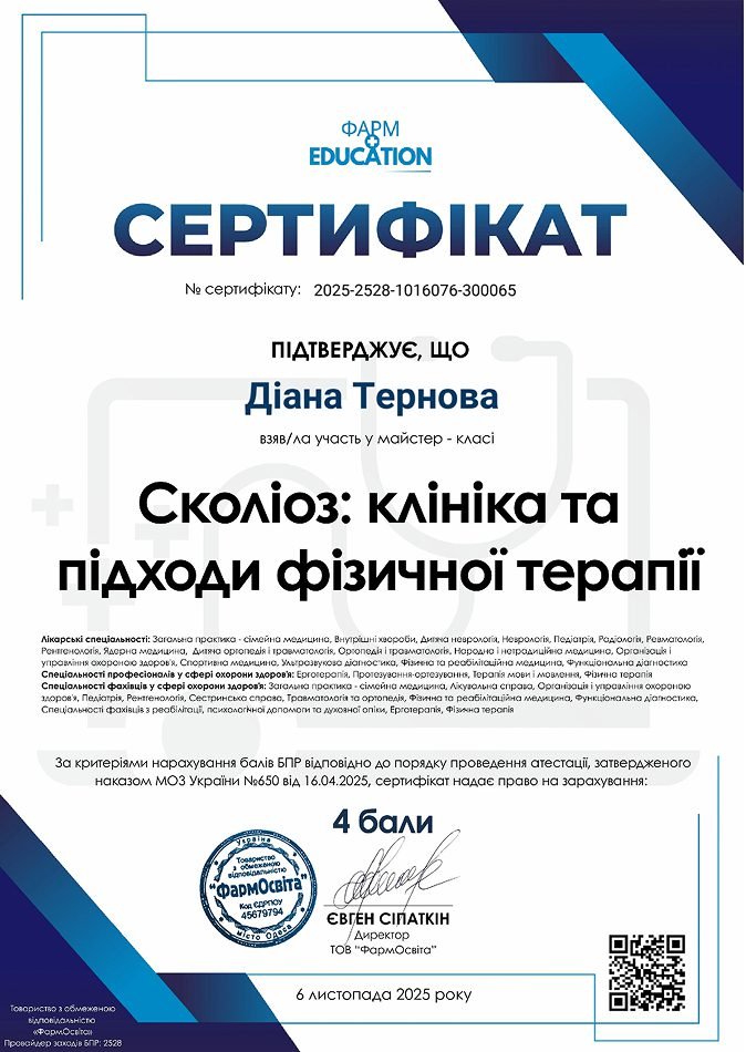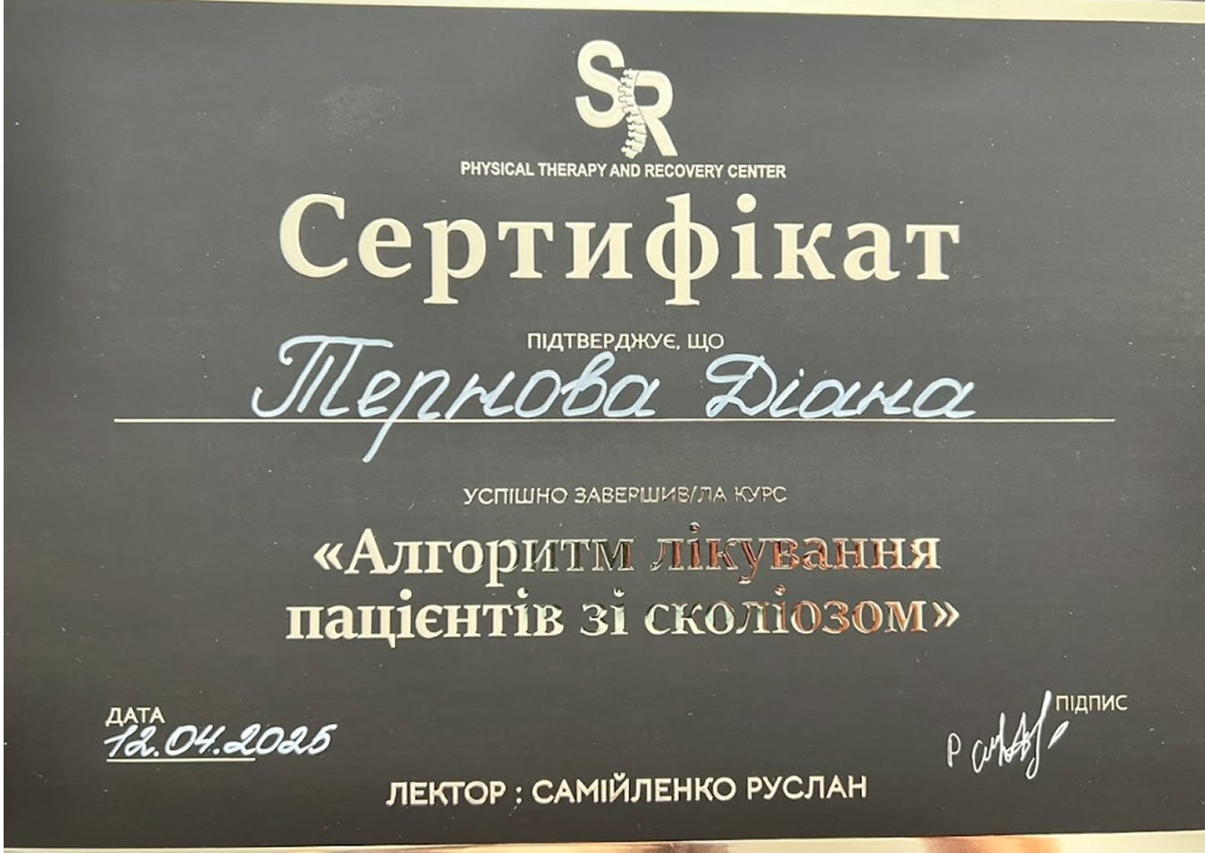 • Курс “Алгоритм лікування пацієнтів зі сколіозом”, Physical Therapy and Recovery Center, 2025 р.
