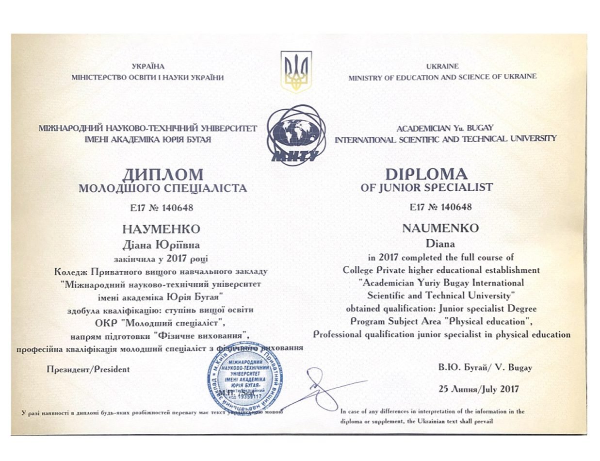 • “Міжнародний науково-технічний університет імені академіка Юрія Бугая”, професійна кваліфікація молодший спеціаліст з фізичного виховання, 2017 р.
