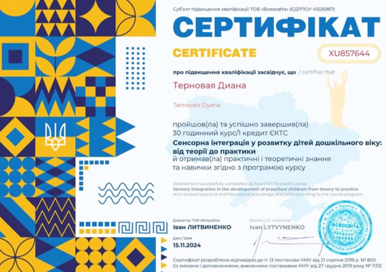 • Суб’єкт підвищення кваліфікації ТОВ “Всеосвіта”, підвищення кваліфікації “Сенсорна інтеграція у розвитку дітей дошкільного віку: від теорії до практики”, 2024 р.