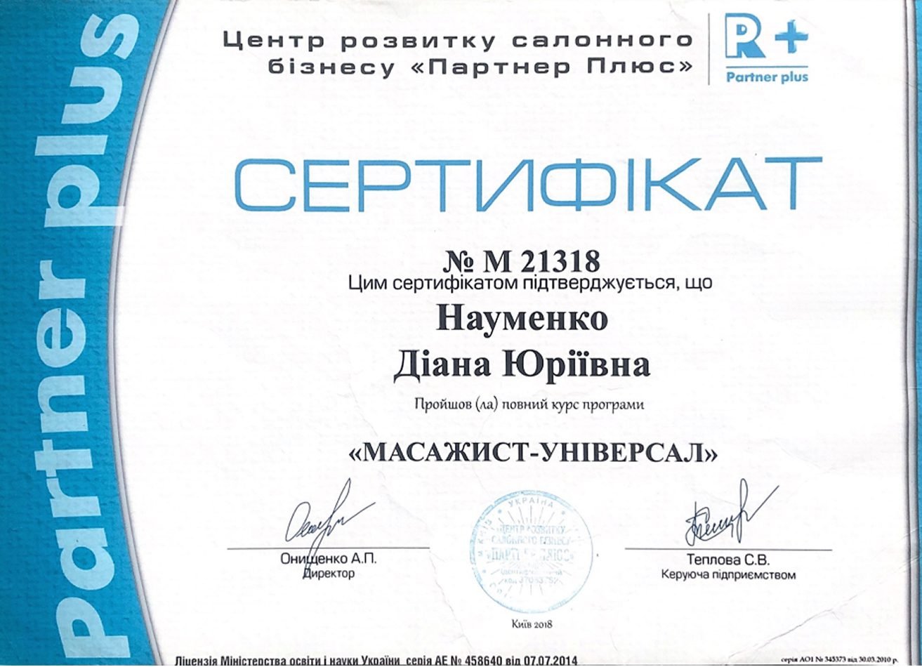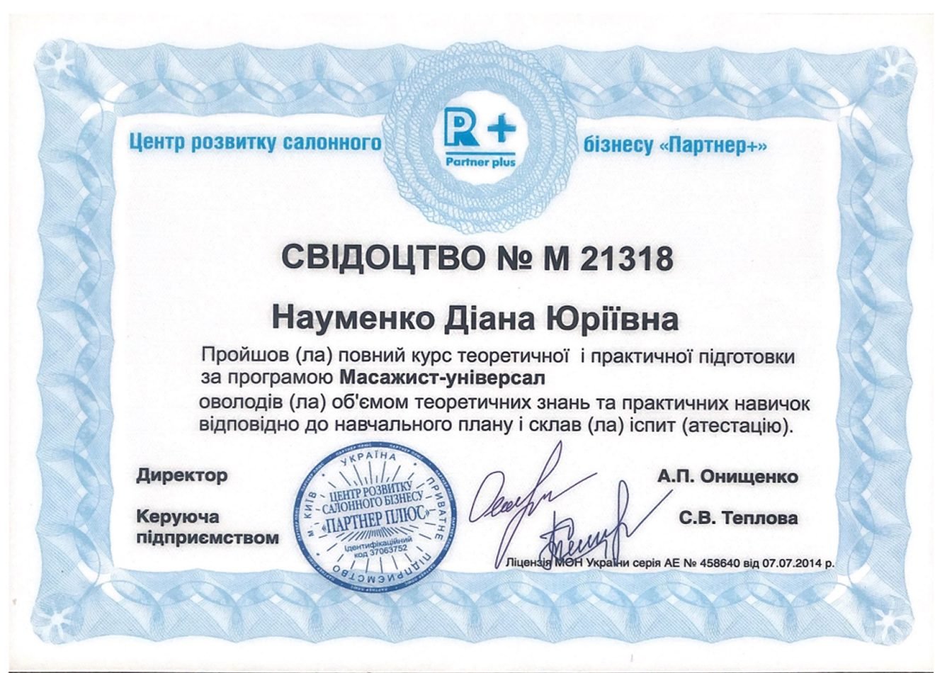 • Курс за програмою “Масажист-універсал”, Центр розвитку салонного бізнесу “Партнер+”, 2014 р.