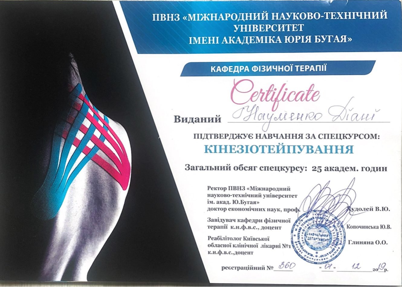 • Курс “Кінезіотейпування”, “Міжнародний науково-технічний університет імені академіка Юрія Бугая”, 2019 р.