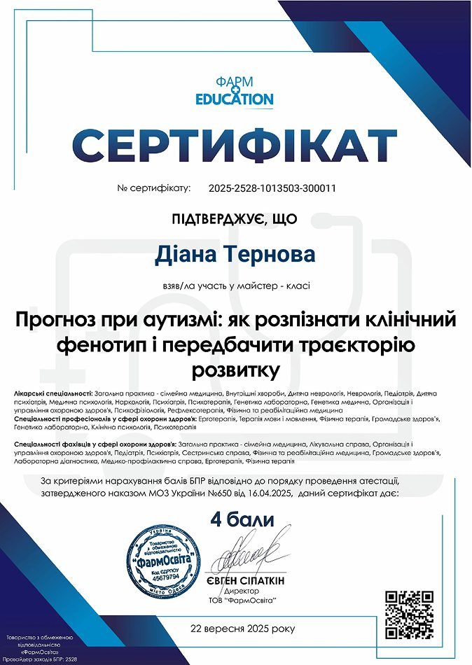 • Участь у майстер-класі  “Прогноз при аутизмі: як розпізнати клінічний фенотип і передбачати траєкторію розвитку “, Фарм Education”, 2025 р.