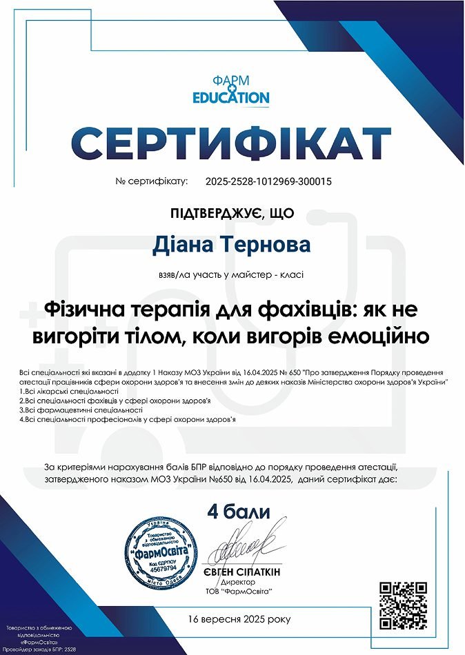 • Участь у майстер-класі  “Фізична терапія для фахівців: як не вигоріти тілом, коли вигорів емоційно “, Фарм Education”, 2025 р.