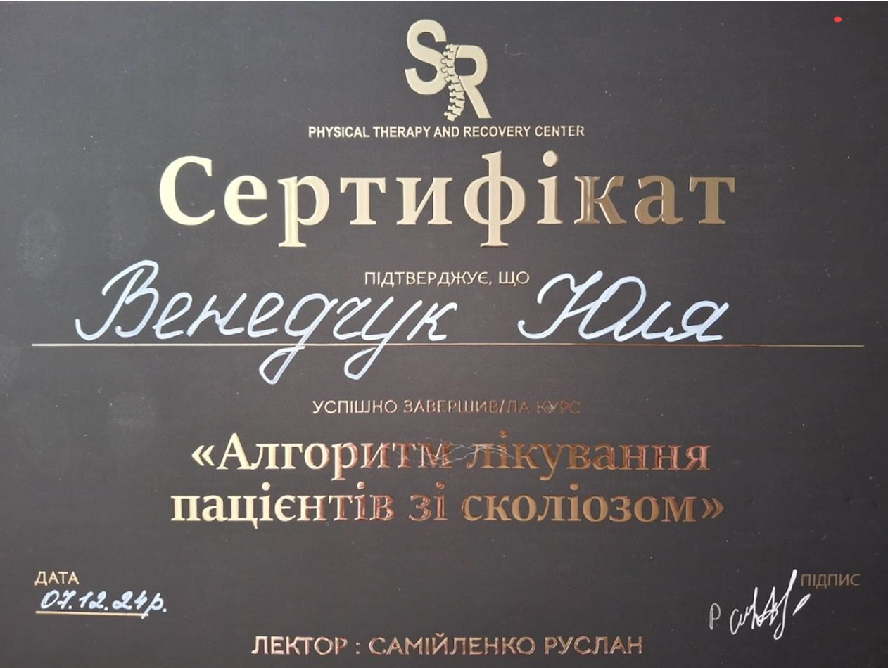 • Курс “Алгоритм лікування пацієнтів зі сколіозом”, Physical Therapy and Recovery Center, 2024 р.