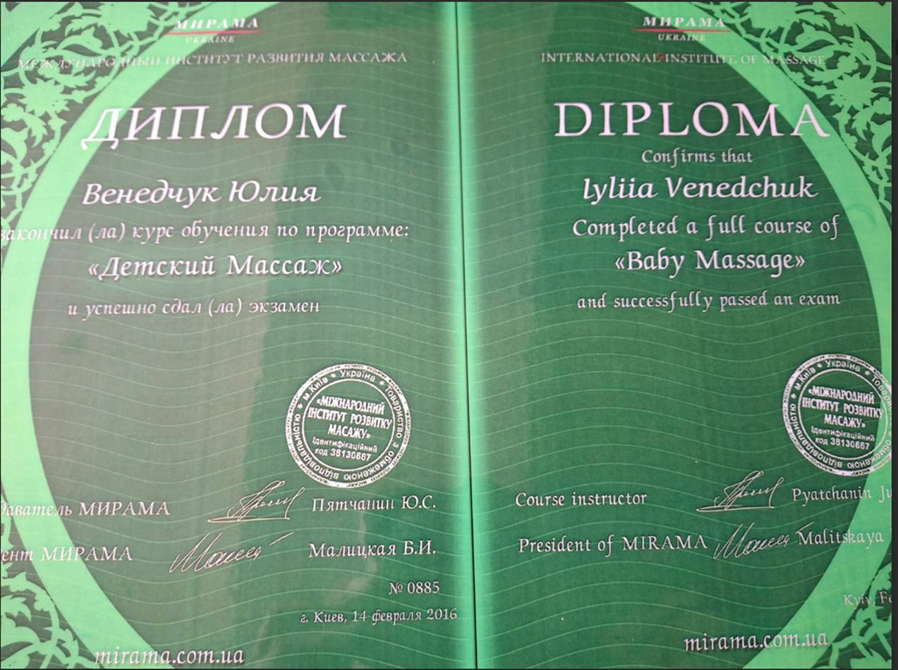 • Курс “Дитячий масаж”, Міжнародний інститут розвитку масажу, 2016 р.