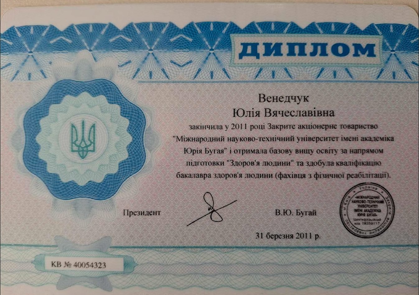 • Міжнародний науково-технічний університет імені академіка Юрія Бугая, “Фахівець з фізичної реабілітації”, 2011 р.