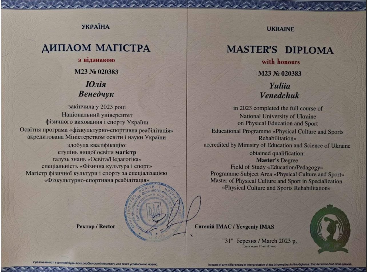 • Національний університет фізичного виховання і спорту України, спеціалізація “Фізкультурно-спортивна реабілітація”, 2023 р.